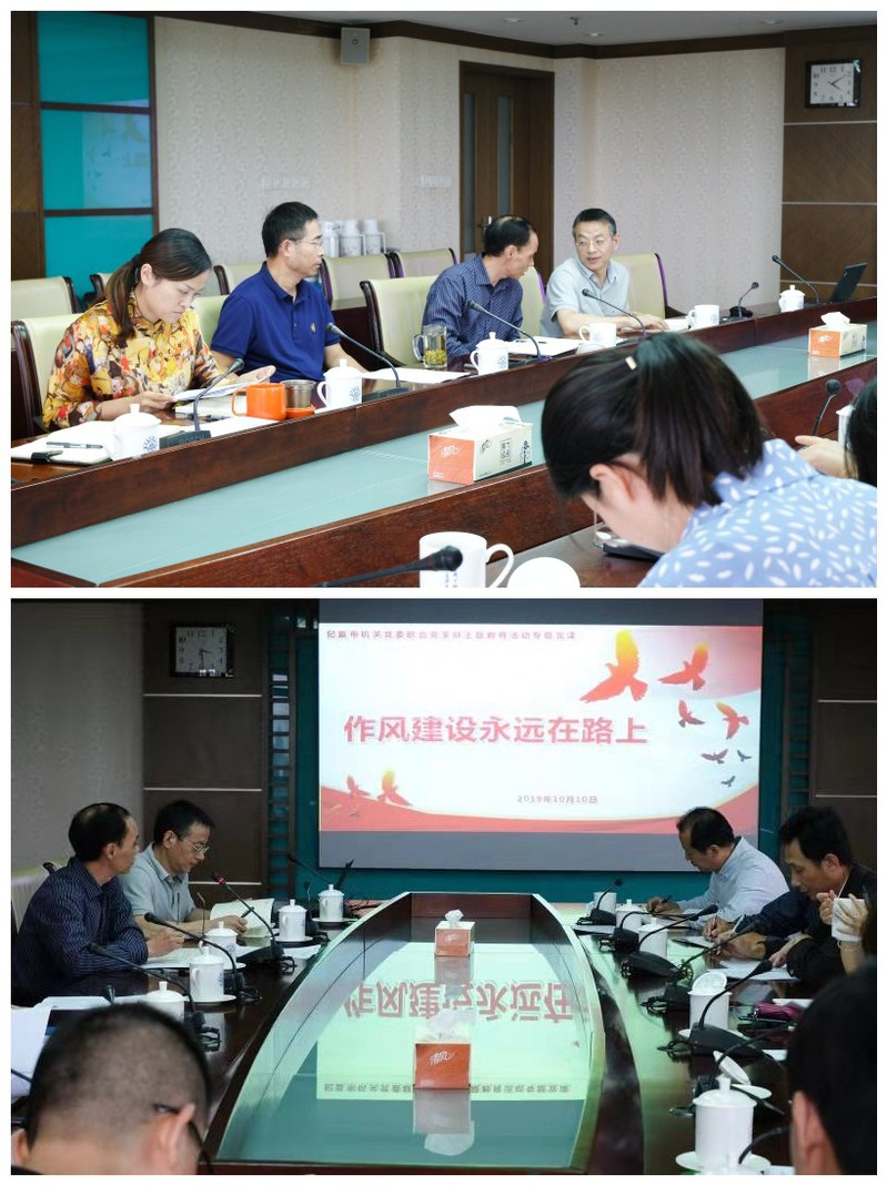 雷江发从作风建设的历史及不同时期的内涵和要求讲起,带领全体党员梳理了新民主主义时期、社会主义革命和建设时期、改革开放和社会主义现代化建设时期的作风建设历史发展脉络。他用习总书记的话“党的作风就是党的形象,关系人心向背,关系党的生死存亡。我们党作为一个在中国长期执政的马克思主义政党,对作风问题任何时候都不能掉以轻心。”强调了作风建设的重要性,作风问题是腐败的温床。他从思想作风、学风、工作作风、领导作风、生活作风五个方面讲起,强调思想作风建设是党的作风建设的灵魂。直接点明不容忽视的作风问题,并深刻剖析原因就是不想变、不敢变、不知变、变到一定程度不愿再变和不讲规矩和没有章法的乱变。同时也对文风会风、落实中央八项规定精神极其实施细则等工作中存在的问题竖了靶子,提出了作风建设的抓手。最后,全体党员共同学习了主题教育专题安排七,《习近平关于全面从严治党论述摘编》中有关作风建设的相关论述。