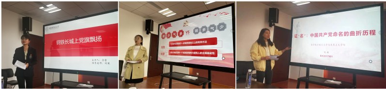 雷江发首先传达了校党史学习教育动员大会精神及党史学习的重要意义。随后马院李哲、陈琳、宋青励三位博士生党员为全体人员上了专题党课。李哲以《钢铁长城上党旗飘扬》为题,在党史学习的基础上,基于“人民军队从哪里来”“人民军队做了什么”和“人民军队何处去”三个问题进行了一系列阐述,结合南航人航空报国情怀强调了党史学习的重要性。宋青励以《从“钢”与“气”谈起——百年大党与中国巨变》为题,从毛泽东同志提出的“钢”与“气”出发,讲到习近平总书记在抗击新冠肺炎疫情中再次强调“钢”与“气”,提供党史学习的新视角。陈琳以《“证”名:中国共产党命名的曲折历程》为题,讲述了中国共产党命名所经历的曲折过程,曲折背后,是中国共产党早期开创者们对于建党一系列问题的思考与探索,从“证”名角度丰富了党史学习内容。