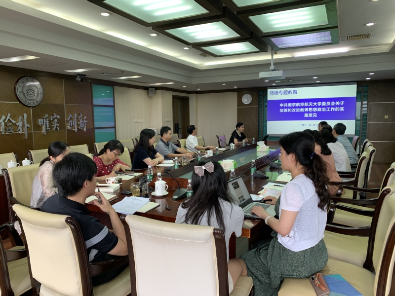 会上支部副书记褚峥同志领学了《中共南京航空航天大学委员会关于加强和改进教师思想政治工作的实施意见》和《南京航空航天大学教职工师德“一票否决”实施办法(试行)》,学习了《新时代高校教师职业行为十项准则》,通报了违反高校教师职业行为十项准则的典型案例,引导大家自觉遵守职业行为准则。